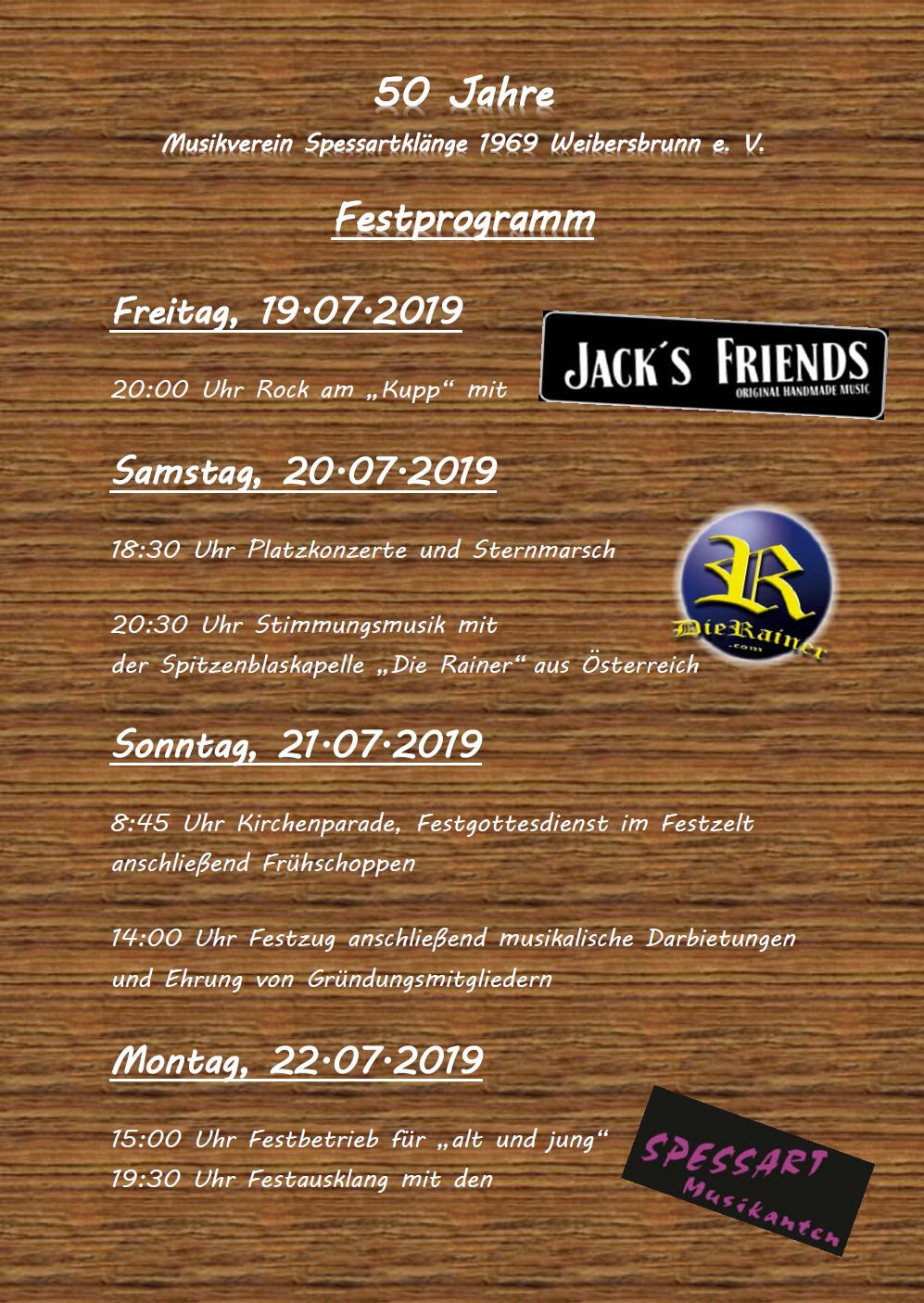 In diesem Jahr feiern die Musikanten in Weibersbrunn das 50 jährige Vereinsjubiläum des Musikvereins Spessartklänge. Wir werden hier weitere Infos posten. Gefeiert wird vom 19.07.2019 bis zum 22.07.2019. Anbei schon mal das Festprogramm